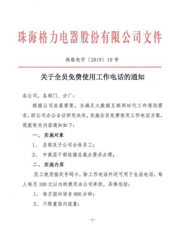 (圖為格力電器發布的《關于全員免費使用工作電話的通知》)
