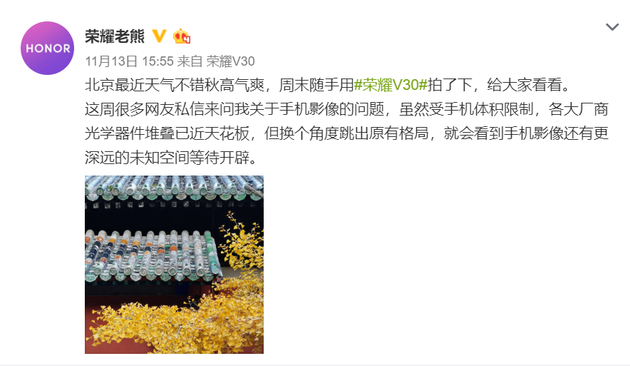 華為和榮耀手機(jī)在業(yè)界有較為突出的影像能力,對(duì)比照發(fā)布后即有網(wǎng)友猜測(cè)類似“夜視儀”效果需要RYYB支撐。此外,據(jù)悉這次曝光的榮耀V30夜拍能力還來(lái)自于其全新搭載的“多維相機(jī)矩陣”。11月13日,榮耀高層曾曝光一張北京秋景照片,也是應(yīng)用多維相機(jī)矩陣的效果,網(wǎng)友評(píng)論多色彩表現(xiàn)能力豐富飽滿,紅、黃、綠、藍(lán)等顏色辨析度高,放大之后原圖的細(xì)節(jié)也較為清晰。從@榮耀老熊的微博小尾巴看,這張秋景圖是用榮耀V30普通版本拍攝,而該系列還有PRO版本,@趙明—George 的微博小尾巴就是“榮耀V30 PRO”。