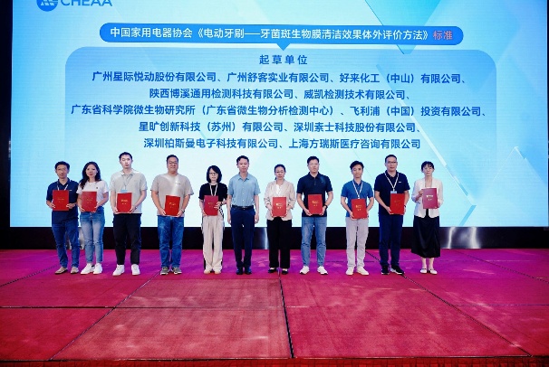 值得關注的是,此次技術交流會的兩項重要議程是《電動牙刷--牙菌斑生物膜清潔效果體外評價方法》和《家用皮膚美容器用LED光源》兩個團體標準的發布。據介紹,《電動牙刷——牙菌斑生物膜清潔效果體外評價方法》標準是由中國家用電器協會美健(個護)電器專業委員會和廣州星際悅動股份有限公司共同提出,電動牙刷行業主流品牌參與制定,是業內首份關于電動牙刷體外牙菌斑清潔效率客觀定量評價體系的標準,經專家評審,一致認為達到了國際領先水平。《家用皮膚美容器用LED光源》標準由中國家用電器協會美健(個護)電器專業委員會和東莞市立德達光電科技有限公司共同提出,家用美容儀主要企業均有參與。會上,由廣州星際悅動股份有限公司的產品部功效實驗室負責人樊曉和東莞市立德達光電科技有限公司副總經理康玉柱分別對兩項標準進行詳細解讀。隨后,朱軍為兩項標準的起草單位頒發了證書。